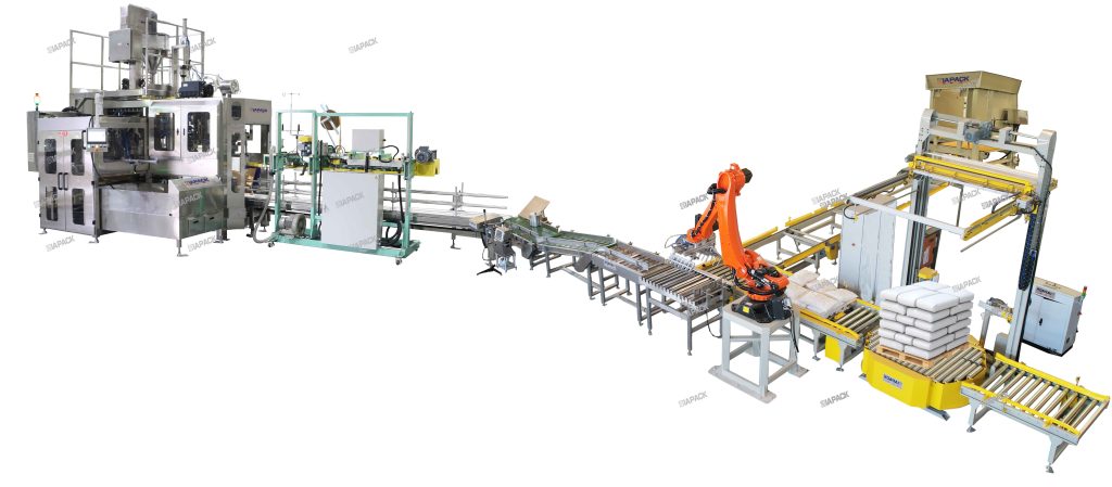 袋子放置器将具有或不具有角撑板的不同尺寸的空袋转移到填充口,其中由于其椭圆形设计,密封闭合允许在填充期间排空空气。动力装置放置在嘴部区域之外,以避免灰尘和/或腐蚀性气氛。