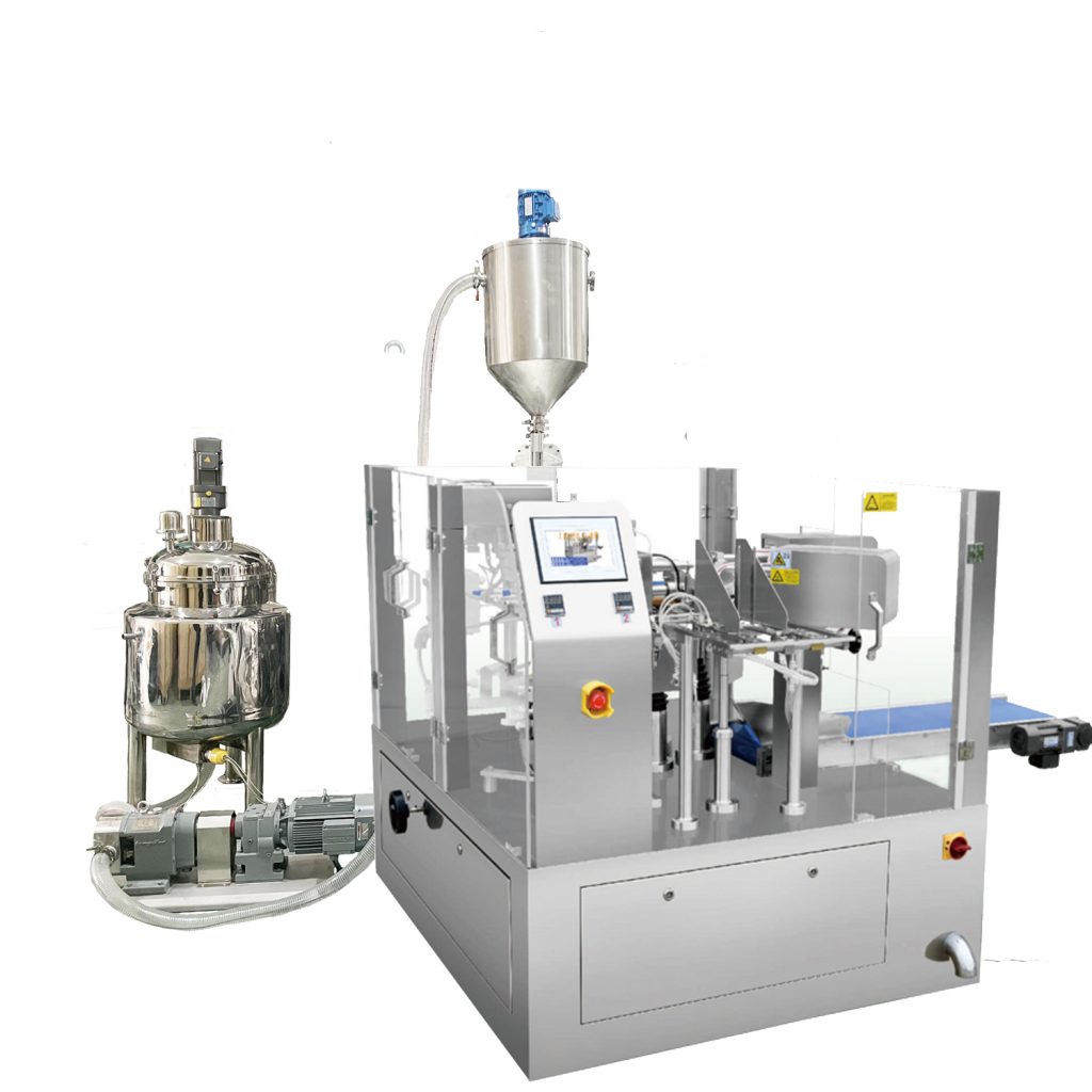 配有活塞式灌装机作为配料系统,广泛应用于洗涤剂,柔软剂,洗发水,沐浴露,牛奶,水,果汁,酱油,油,番茄酱,蛋黄酱等液体和糊状物的包装。