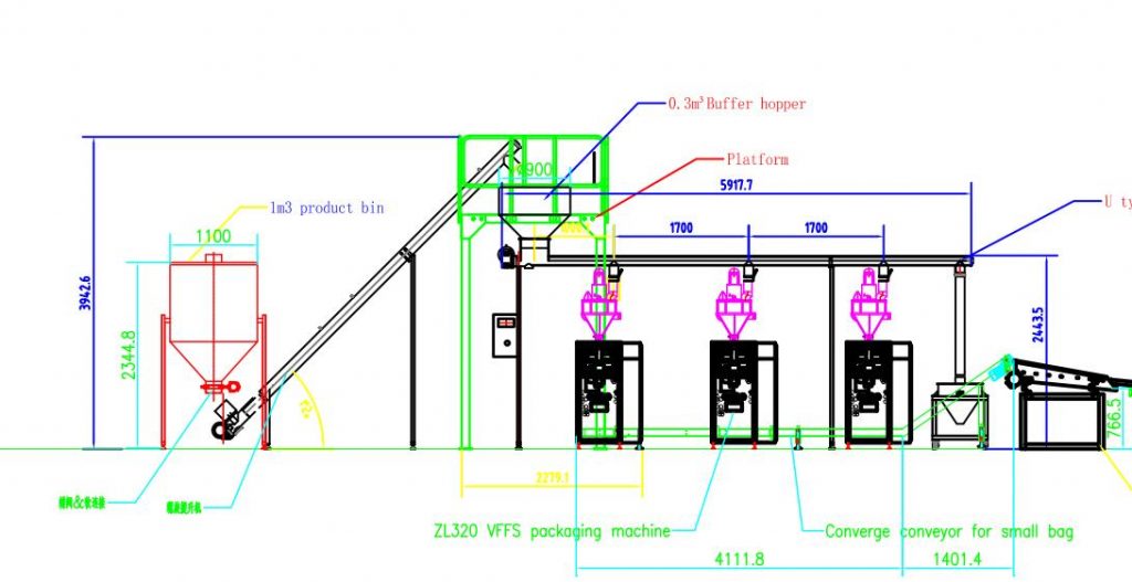 1,小袋成型灌装包装机。这部分包括原料料斗,倾斜螺旋喂料机。中间缓冲料斗,水平喂料螺旋将所有原料送到6台螺旋计量机