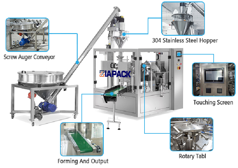 自动旋转式预制袋包装机,用于包装不同的粉末材料。